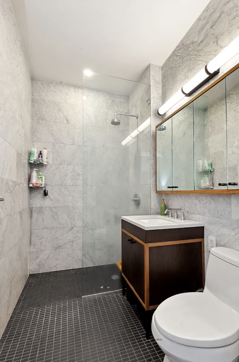 The spa-like bathroom features Pietre DItalia mosaic tile flooring, honed Gioia Carrara stone walls, Kohler fixtures, a rich walnut vanity, and bold blackened steel accents. Wide-plank herringbone tobacco-smoked oak floors run throughout the home, complemented by 12' ceilings and two oversized casement windows that bathe the living space in natural light. A discreet all-in-one LG washer/dryer adds to the homes ease and efficiency.