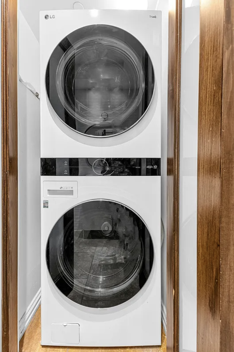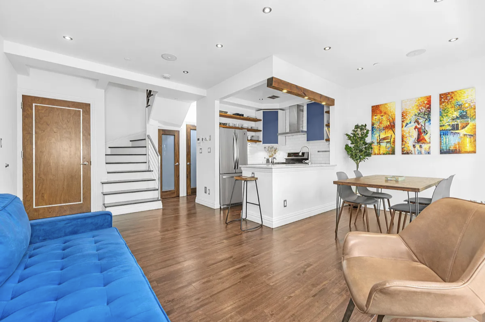 Leave everything at the door in a private, enclosed foyer before stepping into your great room, an open-plan space with ample opportunity for seating, dining, and cooking—perfect for either entertaining or a quiet night at home. If the mood fits, open the sliding doors and let the outside in to create an even more bright and expansive feeling. You'll also enjoy *newly refinished* dark walnut hardwood floors throughout. Your contemporary kitchen is suited with an extra-wide LG stainless steel refrigerator and five-burner stove (with vented hood), a Bosch dishwasher, and custom reclaimed wooden shelves courtesy of Brooklyn Reclaimed. The primary level also features a powder room, generous storage, and a washer/dryer unit by LG ThinQ.