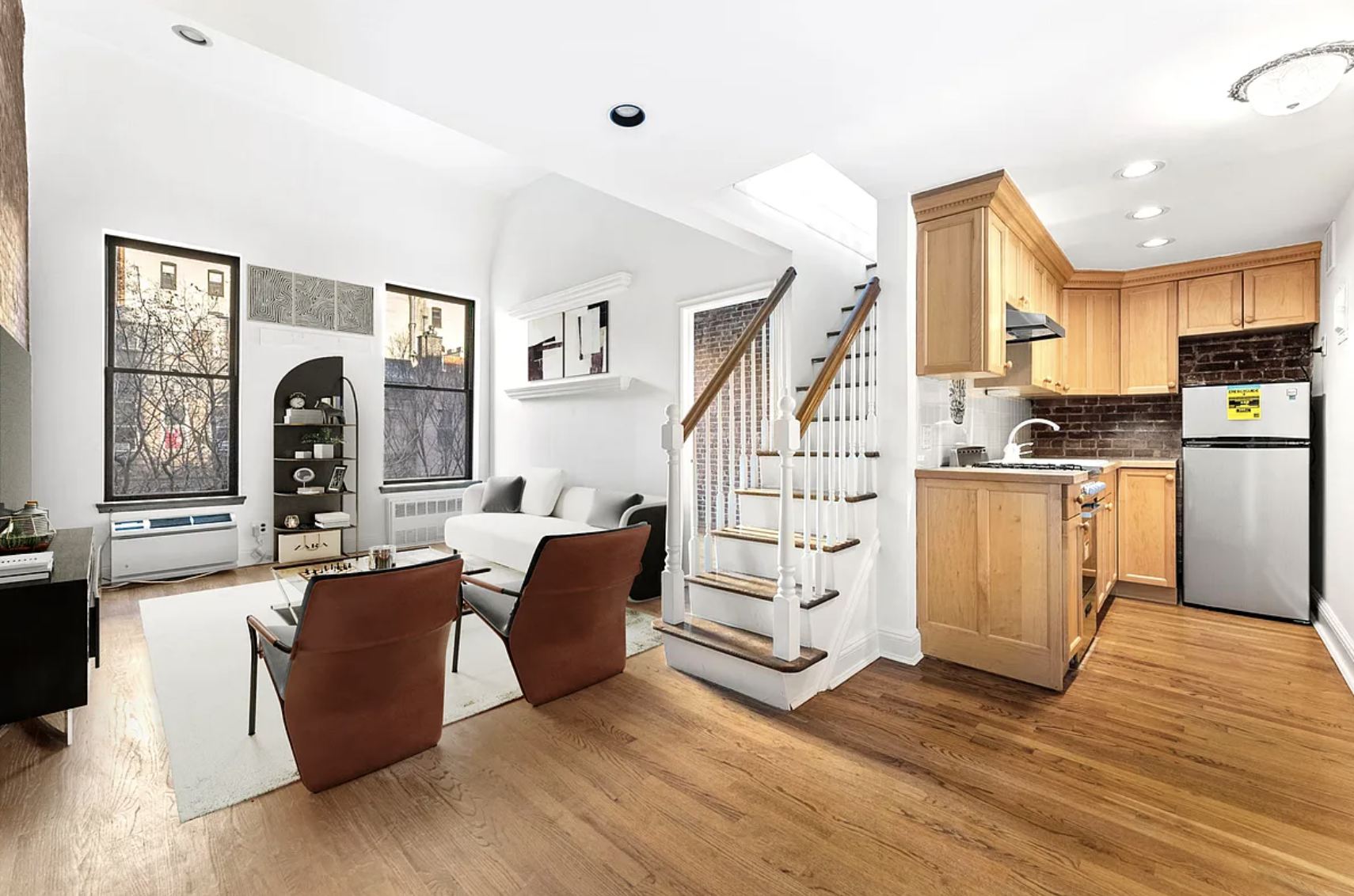 Enter this sun-drenched move-in ready duplex and be welcomed by approximately 12-foot soaring ceilings in the living room, exposed brick, and abundant natural light. The first level features a comfortable living and dining area—perfect for cozy evenings or entertaining family and friends.