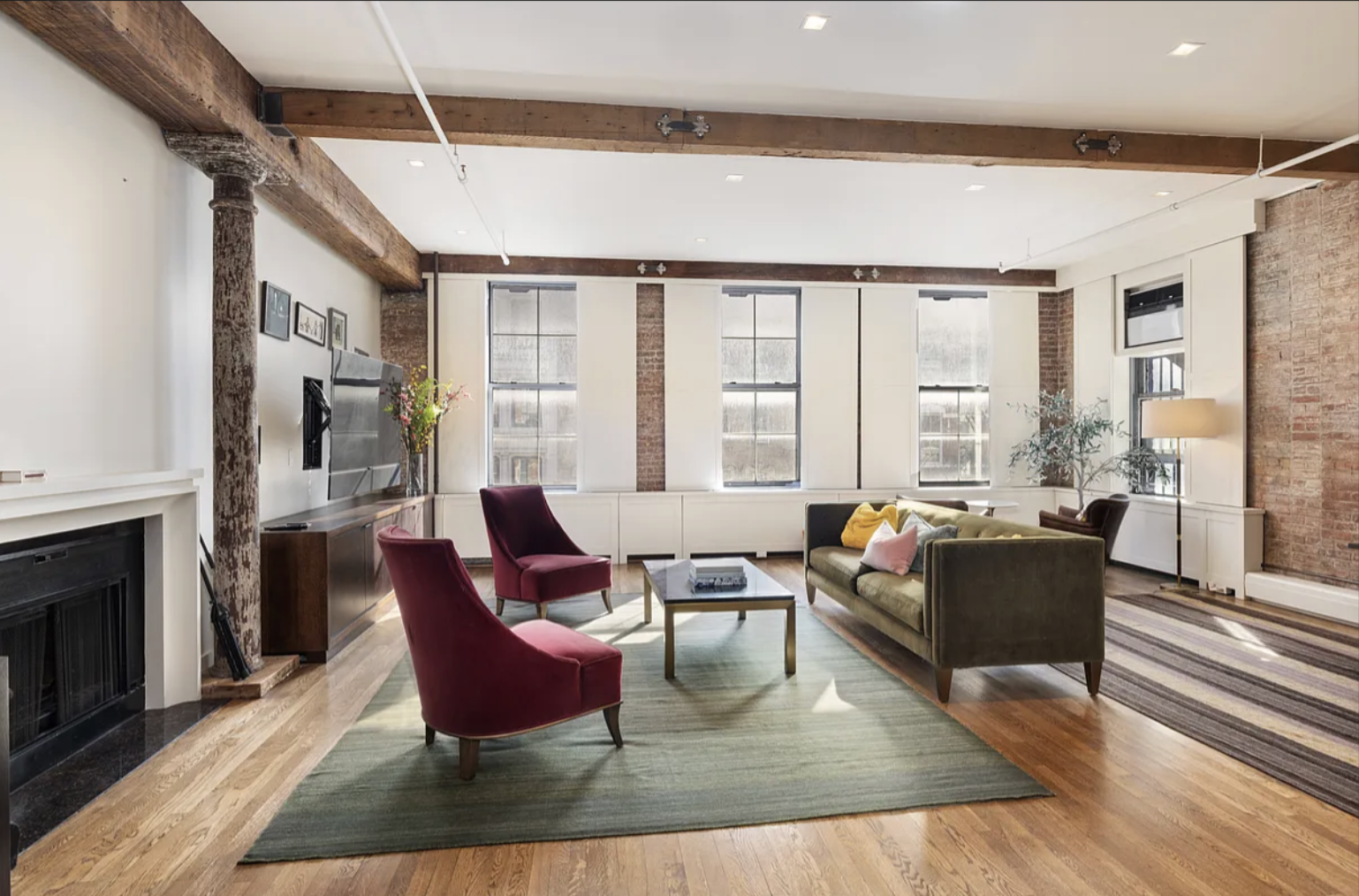 Enjoy the essence of Soho living in this authentic, prewar loft! A gracious foyer leads to an expansive open layout featuring a sleek, modern kitchen, an inviting living area, and defined spaces for dining and additional seating. The expansive living space is filled with natural light coming through three oversized east-facing windows, complemented by corner exposures to the south.Charming architectural details include exposed wood ceiling beams, industrial cast-iron columns, exposed brick walls, a wood-burning fireplace, and polished wenge hardwood floors.